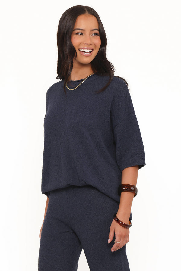 Elevate your everyday wardrobe with the Ashby Knit Top in Navy. This versatile essential combines comfort and effortless style with its chic round neckline and classic short sleeves.