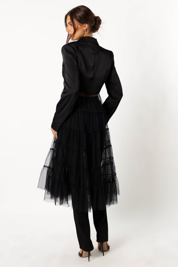 This blazer is perfect for making a statement at any event. With its peak lapels, long sleeves, you’ll be turning heads no matter the occasion. You’ll also love the tulle skirt design that gives the crop blazer an edgy look without compromising on comfort.